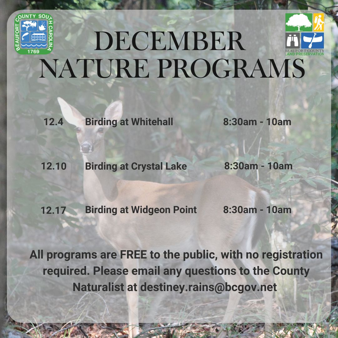 Program offerings include types such as trail talks, fish clinics, birding hikes, saltmarsh meanderings, herpetology clinics, and pollinator talks. Programs are offered on the County preserve properties, as well as in school classrooms and for private communities.
