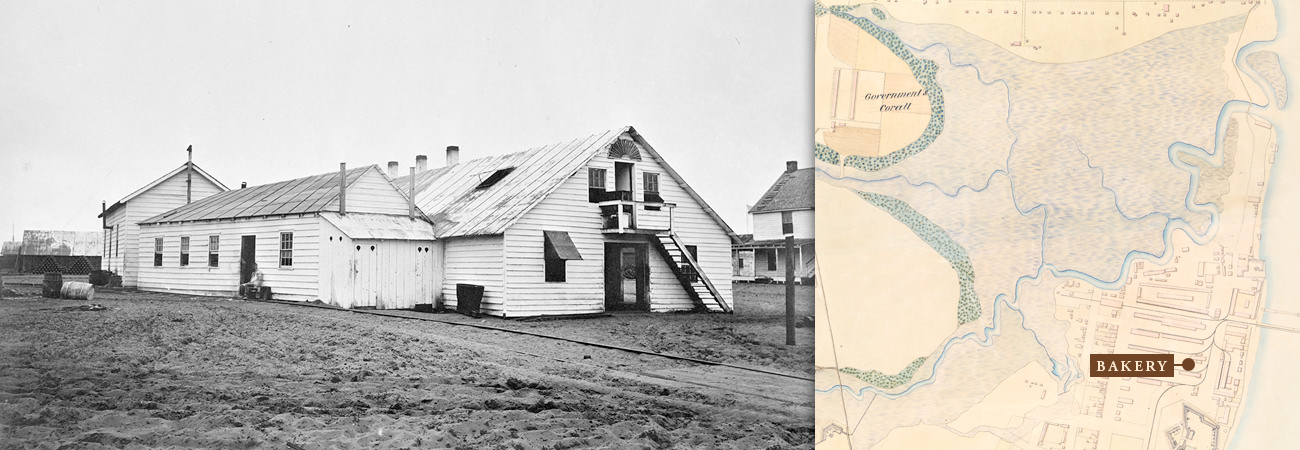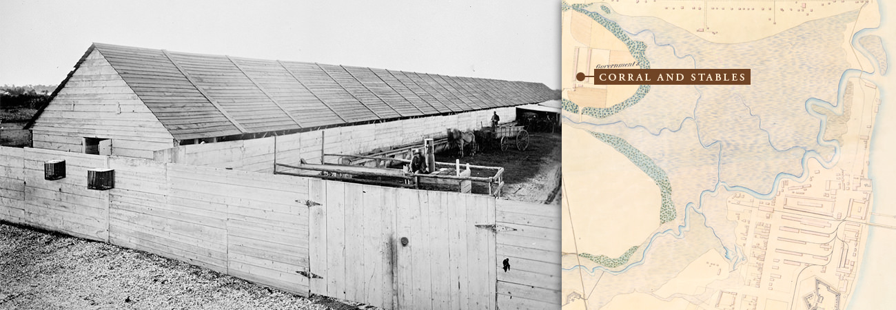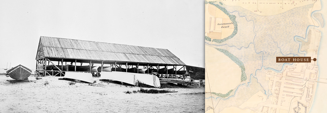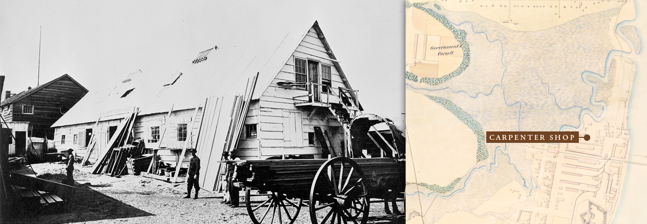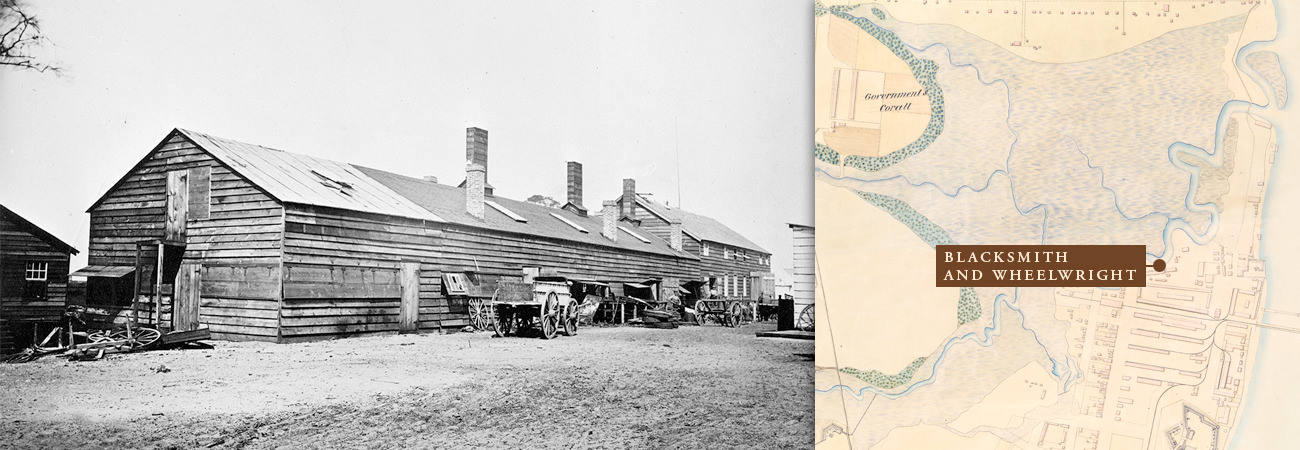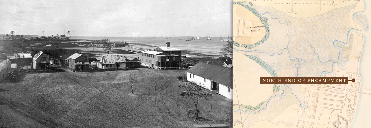 An 1865 map shows the encampment's many buildings, Fort Welles, Fort Sherman, and the lines of earthworks. Samuel A. Cooley, official photographer for the Department of the South, also gives us a glimpse of the encampment through dozens of photographs. These photographs are available through the National Archives and Records Administration. Researchers were able to correlate some of the photographs with the map. Click on the map above to see Cooley's photographs.