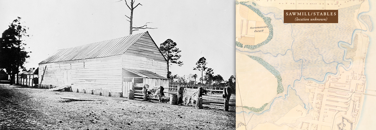 Once the Union Army determined the Confederates had abandoned Hilton Head Island, they set about building a base of operation. Fort Walker, at the north end of the Island on the Coggins Point Plantation, was the center of activity. The army took over the plantation house and used it as its headquarters. The occupying forces built extensive earthworks including Fort Sherman and Fort Welles. Troop camps were established across the island. The Third New Hampshire Volunteers camped at Fish Haul Plantation adjacent to the encampment where they were directed to build a sawmill. Lumber from the mill was used to construct buildings in the encampment including storehouses, commissaries, stables, carpenter shops, docks, and barracks for the African American refugees arriving daily at the Union lines.
